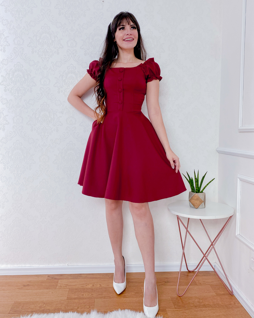 • Busto quadrado com botões forrados: o busto possui um recorte reto e elegante, seguido por delicados botões forrados — um charme clássico! Como são botões fakes, você pode se movimentar livremente, sem preocupações com repuxos ou aberturas indesejadas.