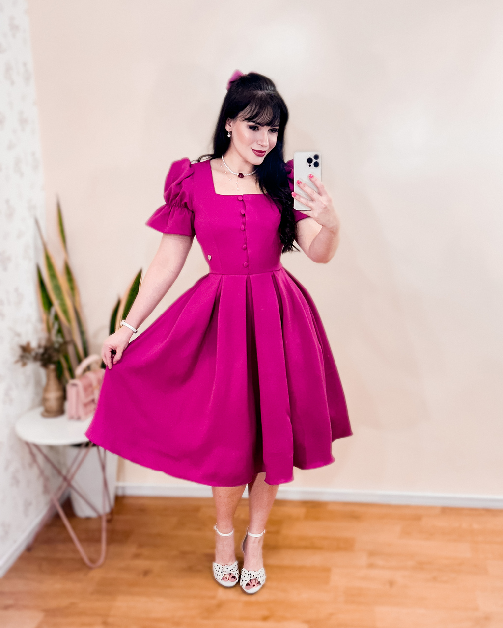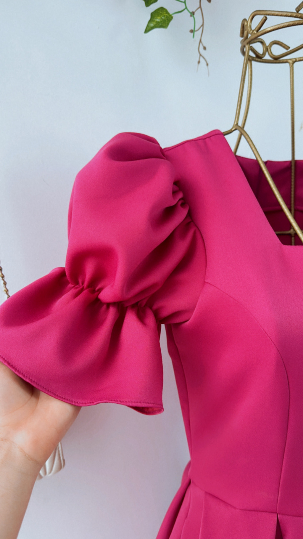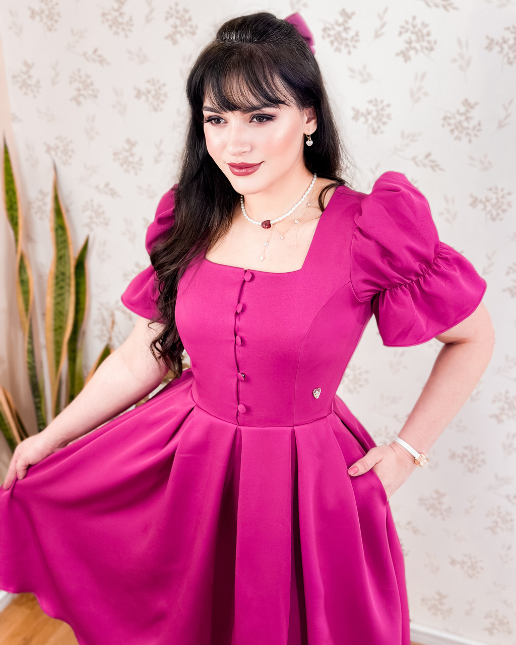 O recorte quadrado no busto traz estrutura e sofisticação, emoldurando o colo com delicadeza clássica. Já as mangas bufantes, formadas pelo frisado sutil na parte superior, evocam a feminilidade dos tempos em que vestir-se bem era sinônimo de respeito e reverência ao cotidiano.