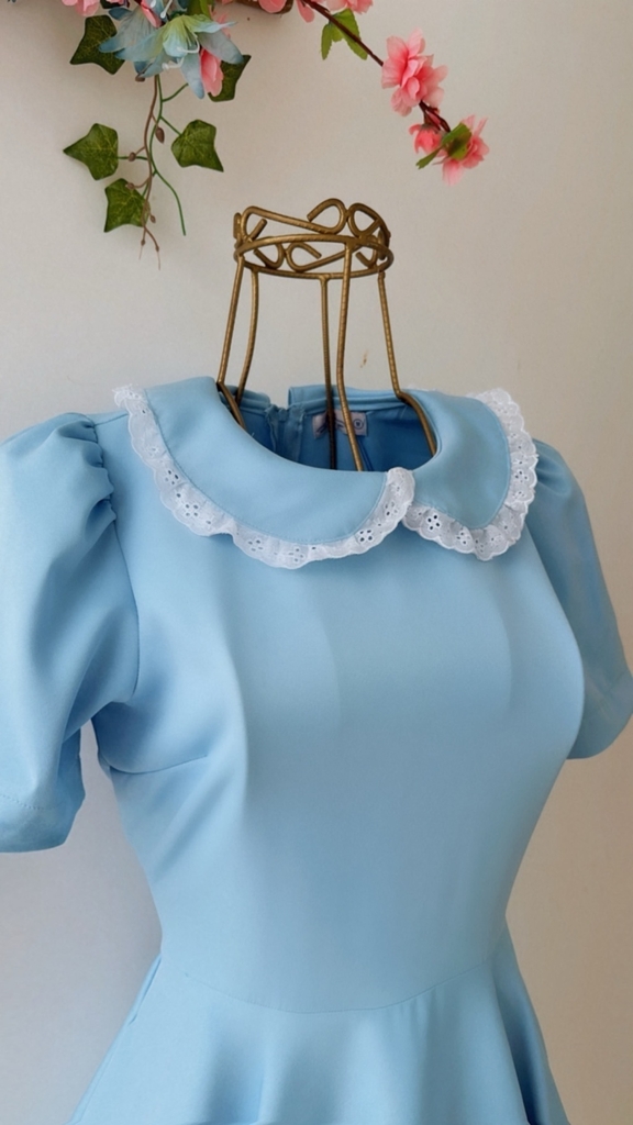 Gola Peter-Pan com detalhes exclusivos: A delicada gola Peter-Pan que já adiciona um charme sutil, agora deixa o modelo ainda mais vintage e elegante, pois conta com renda guipir em sua borda.