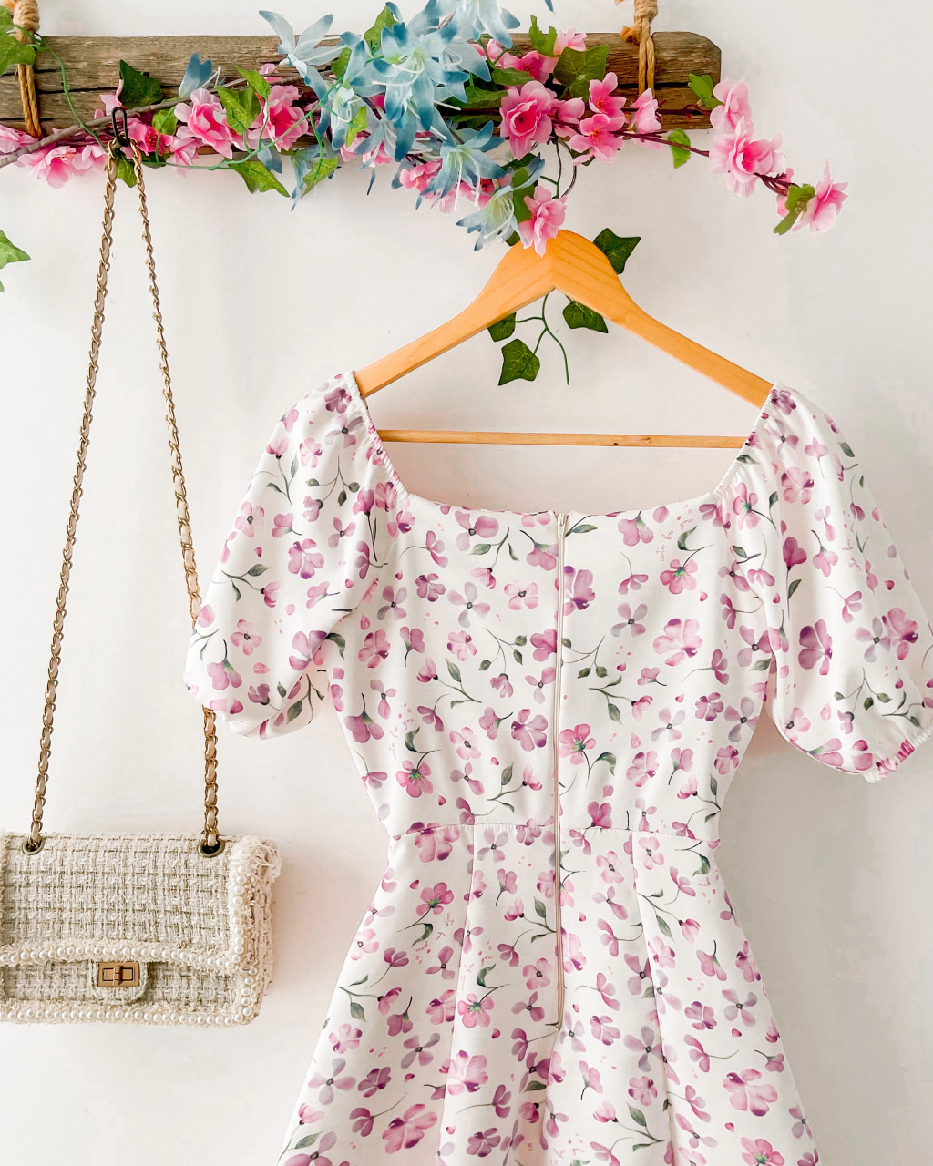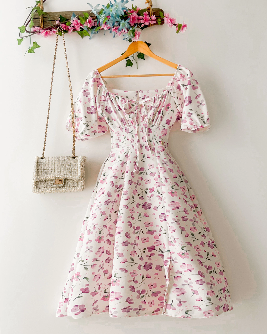 Cordões de Ajuste: No busto, o vestido conta com dois cordões que garantem um ajuste perfeito, criando um delicado franzido que se estende até a pala bem curvada.